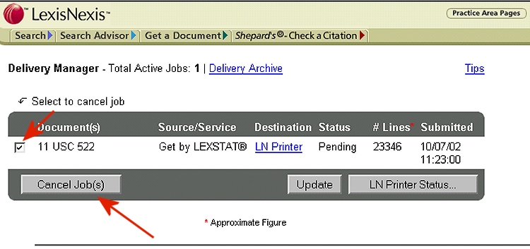 | From the Delivery Manager page, you can check the status of and cancel print jobs. Check the box for 11 USC 522 and select the Cancel Job(s) button to stop printing. If your print job doesn't print, it's a good idea to check the Delivery Manager before resending the job to the printer. |